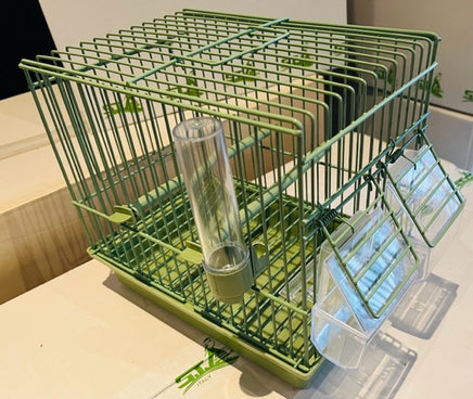 Plastic transport cage 12x8x10 in. Comes all equipped with feeders and perches.Can be used as hospital cage. GREEN ONLY