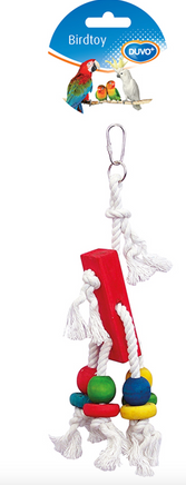 Suitable for small to medium size bird. Made with rope and coloured pine blocks. Aprox. 6in
