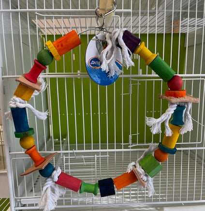 Suitable for medium to large size bird. Made with coloured pine blocks.